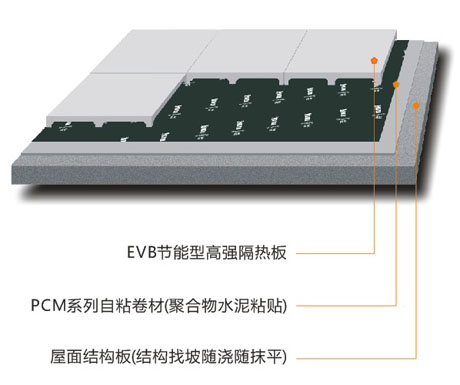 屋面防水保溫隔熱一體化系統(tǒng)的結(jié)構(gòu)層次為結(jié)構(gòu)層——青龍PCM系列自粘防水卷材——EVB節(jié)能型高強隔熱板(如下圖),大大減少傳統(tǒng)防水保溫屋面構(gòu)造層次,減輕了屋面載荷,而且施工十分簡單,屋面防水維修非常方便,綜合性價比高,完全滿足屋面熱工指標計算要求,防水、隔熱效果顯著,防火等級為A級。