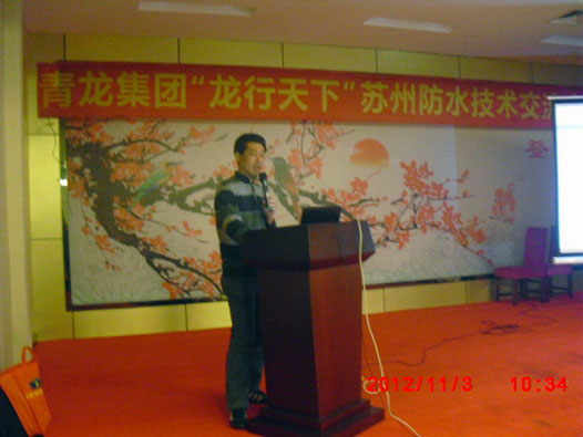 2012年11月3日,龍行天下之青龍建材防水技術交流會蘇州站在昆山市華東大酒店舉行。此次技術交流會由青龍?zhí)K州分公司承辦,共有60余人參加。
