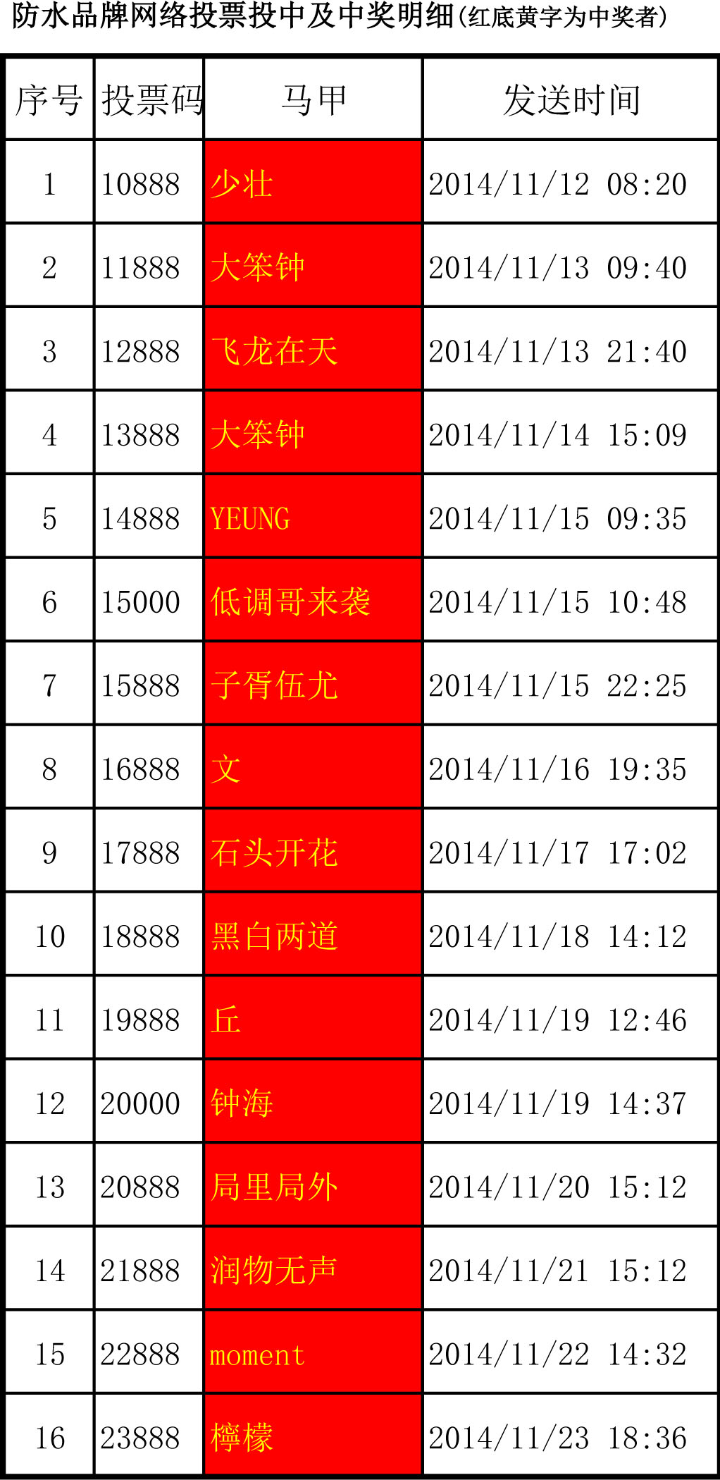 前16項(xiàng)投中及中獎(jiǎng)名單公布如下:少壯、大笨鐘、飛龍?jiān)谔?、大笨鐘、YEUNG、低調(diào)哥來襲、子胥伍尤、文、石頭開花、黑白兩道、丘、鐘海、局里局外、潤物無聲、moment、檸檬。恭喜他們,也請(qǐng)大家繼續(xù)支持青龍,只為青龍投票!