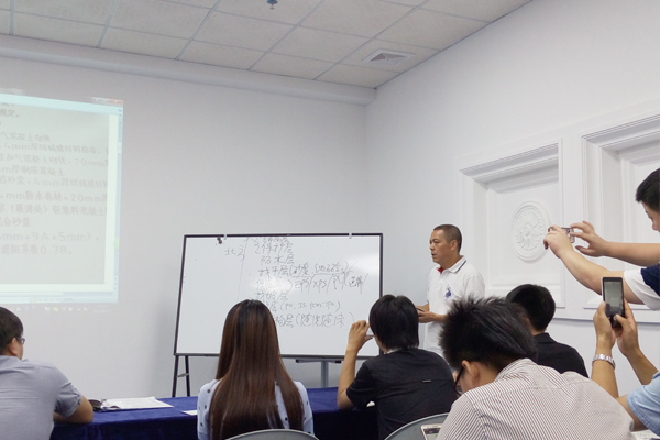 會(huì)議的之后,為提升公司業(yè)務(wù)人員防水等專業(yè)水平,培養(yǎng)解決各種復(fù)雜防水難題的能力和自信心,公司董事長(zhǎng)宋敦清先生親自言傳身教,以地下室底板、地下室頂板、地下室側(cè)墻、屋面等防水設(shè)計(jì)方案為參照,引導(dǎo)大家共同設(shè)計(jì)出最有效,最經(jīng)濟(jì)的防水保溫設(shè)計(jì),鼓勵(lì)大家轉(zhuǎn)變觀念,靈活應(yīng)用。宋總的講解讓大家受益匪淺,也深深理解了防水專業(yè)知識(shí)的重大意義。
