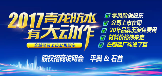 2017年2月5日和2月8日,青龍建材股份將分別在河南平輿和湖北石首召開以"零風險做股東"為主題的股權(quán)招商會,這是一場以防水材料工廠經(jīng)營、盈利模式發(fā)展趨勢研討和青龍建材股權(quán)招商為一體的項目招商說明會,屆時還將舉辦與防水相關(guān)的大型活動。