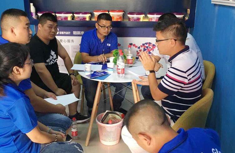 開業(yè)期間,周總還特別組織召開了青龍家裝防水補漏新產(chǎn)品發(fā)布會。青龍賀總近距離與大家分析、把脈防水堵漏領(lǐng)域現(xiàn)狀,并就近年防水市場新機遇、新產(chǎn)品、新技術(shù)、新理念進行了分享。他強調(diào),2018年是進入建筑修繕堵漏領(lǐng)域最好的時機,先進入將獲得更多的優(yōu)勢,然后,簡單介紹青龍?zhí)厣S修堵漏產(chǎn)品的優(yōu)勢,為大家指明了方向,也增強了大家做建筑修繕的信心。