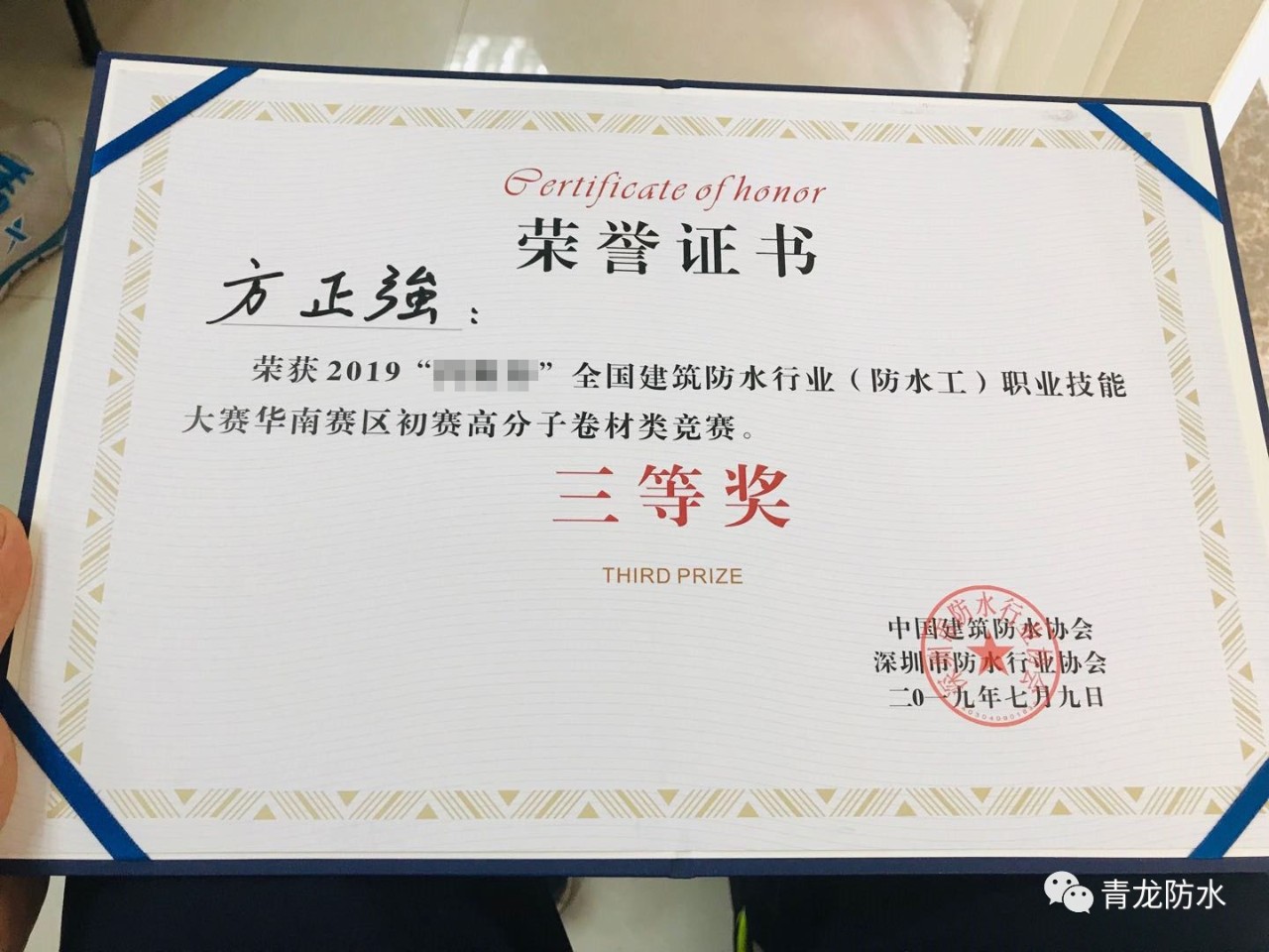 7月9日,由中國(guó)建筑防水協(xié)會(huì)、深圳市防水行業(yè)協(xié)會(huì)共同主辦的2019年全國(guó)建筑防水行業(yè)職業(yè)技能大賽(華南賽區(qū))初賽圓滿落幕,來(lái)自青龍公司工程部的方正強(qiáng)獲得全國(guó)建筑防水職業(yè)技能大賽三等獎(jiǎng)的好成績(jī)。