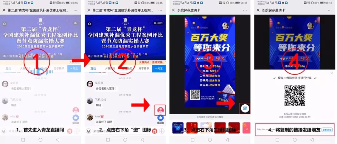 2、邀約朋友進(jìn)直播間觀看有獎:凡邀約朋友進(jìn)入青龍直播間觀看,直播榜單上的邀約人數(shù),即成為你的邀約榜單人數(shù),每邀約1人即可獲得1元獎勵。最終獎勵僅限前10名。同時為保證活動的公正性,凡后臺發(fā)現(xiàn)數(shù)據(jù)增加異常,系統(tǒng)將自動判定為惡意作弊,將取消其參加活動資格。(邀約方法:青龍直播間→右下角"邀"圖標(biāo)→右下角二維碼圖標(biāo)→將復(fù)制的鏈接發(fā)給微信朋友。朋友點擊后,即成為你的邀約下線。)