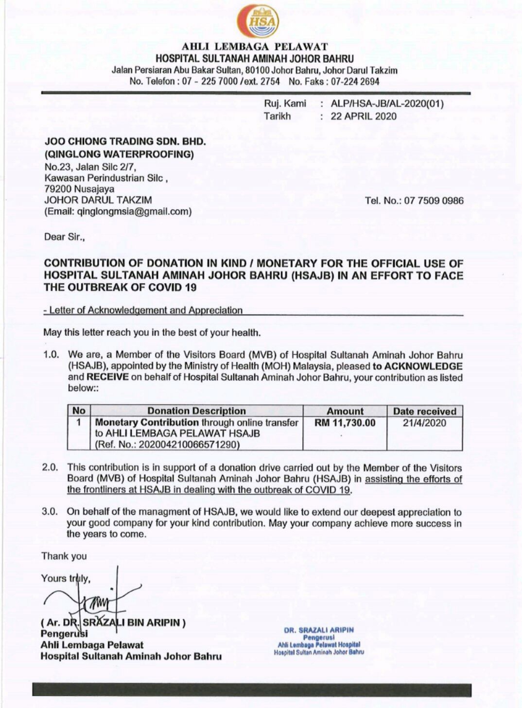 近日,馬來西亞Hospital Sultanah Aminah柔佛州新山醫(yī)院在收到物資后,致函表示了真誠(chéng)的感謝,感謝青龍公司和廣大客戶的仁義之舉。