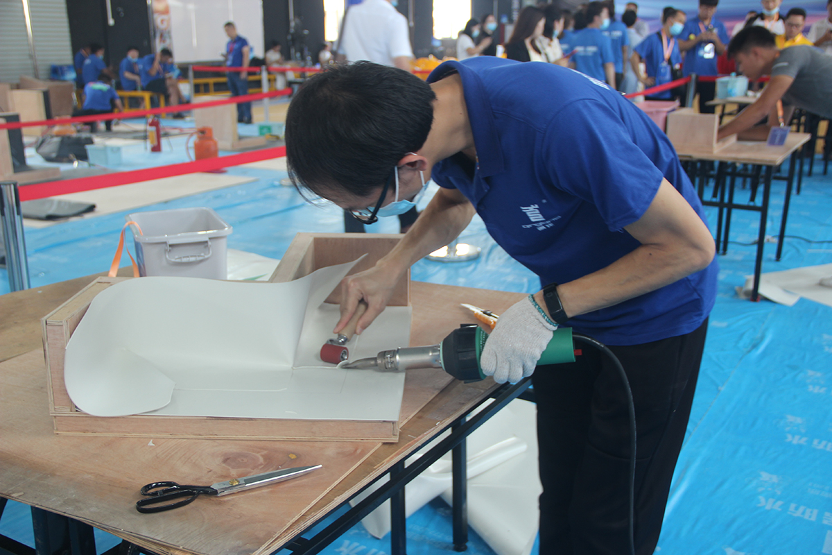那么這邊是PVC高分子自粘膠膜,它也主要是考驗(yàn)選手的搭接,搭接不牢的話,卷材就會(huì)容易竄水。高分子類,不管是PVC、HTPE、還是TPO,它們都是同樣的施工方法。我們現(xiàn)場(chǎng)比賽選用的是青龍的PVC防水卷材,它的搭接原理是熱風(fēng)焊接。熱風(fēng)焊接可分單焊線和雙焊線,選手比賽也是模擬屋面項(xiàng)目,先是裁線、剪切,然后是搭接,搭接縫也不能低于6公分。因?yàn)楦叻肿硬牧系膹埩Ρ容^強(qiáng),它沒(méi)有改性瀝青材料那樣服貼,它的難度相對(duì)于SBS要稍高的。