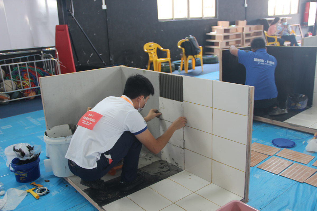 前面有一組是做衛(wèi)生間貼磚。傳統(tǒng)的認(rèn)知,大家都以為防水技能工一定是農(nóng)民工,在社會(huì)地位得不到尊重。但是在這次的比賽場(chǎng),有一個(gè)有趣的現(xiàn)象,選手越來(lái)越年輕化,你看還有很多是小鮮肉、小帥哥。所以說(shuō)防水技能工不是沒(méi)有技術(shù)含量的普通的農(nóng)民工,而是有技術(shù)含量,可以受到社會(huì)認(rèn)可的。包括今天的這次比賽,也是全國(guó)人社廳認(rèn)可的,如果成績(jī)優(yōu)異的選手,都會(huì)獲頒發(fā)證書的。所以說(shuō),我們的選手越來(lái)越年輕化,不用擔(dān)心青黃不接的問(wèn)題。