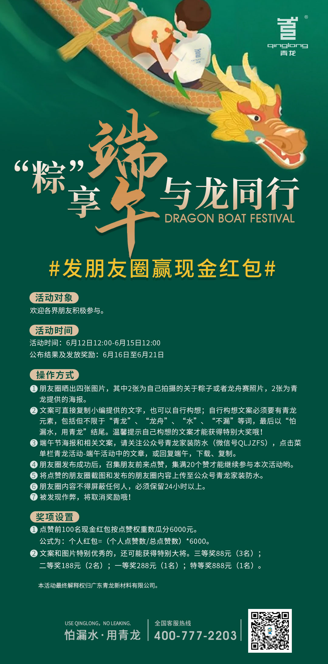 (2)文案可直接復制小編提供的文字,也可以自行構想;自行構想文案必須要有青龍元素,包括但不限于"青龍"、"龍舟"、"水"、"不漏"等詞,最后以"怕漏水,用青龍"結尾。(溫馨提示:自己撰寫的文案才能獲得特別大獎哦?。?/p>
