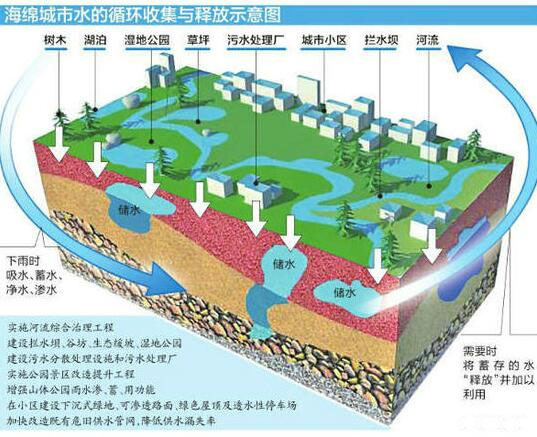 建海綿城市就要有“海綿體”。城市“海綿體”既包括河、湖、池塘等水系,也包括綠地、花園、可滲透路面這樣的城市配套設(shè)施。雨水通過這些“海綿體”下滲、滯蓄、凈化、回用,之后剩余部分徑流通過管網(wǎng)、泵站外排,從而可有效提高城市排水系統(tǒng)的標(biāo)準(zhǔn),緩減城市內(nèi)澇的壓力。