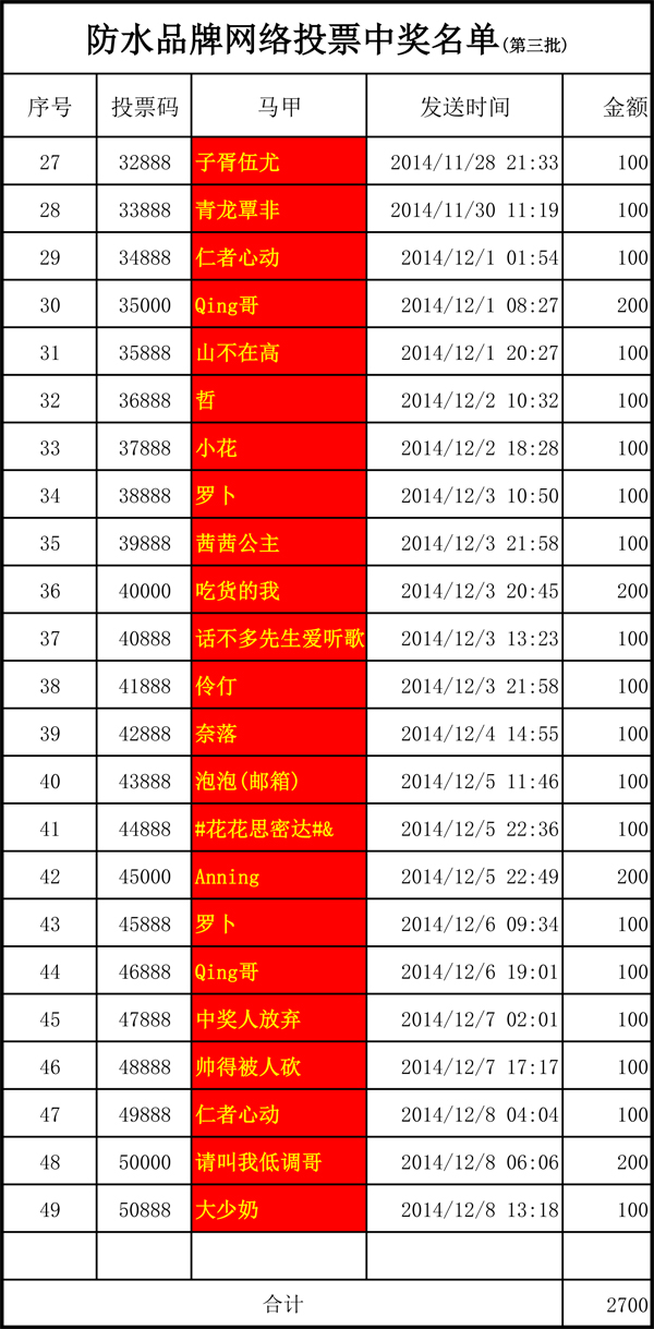 第三批中獎(jiǎng)名單公布如下:子胥伍尤、青龍覃非、仁者心動(dòng)、Qing哥、山不在高、哲、小花、羅卜、茜茜公主、吃貨的我、話不多先生愛聽歌、伶仃、奈落、泡泡(郵箱)、#花花思密達(dá)#&、Anning、羅卜、Qing哥、帥得被人砍、仁者心動(dòng)、請(qǐng)叫我低調(diào)哥、大少奶。恭喜他們,也請(qǐng)大家繼續(xù)支持青龍,為青龍投票!