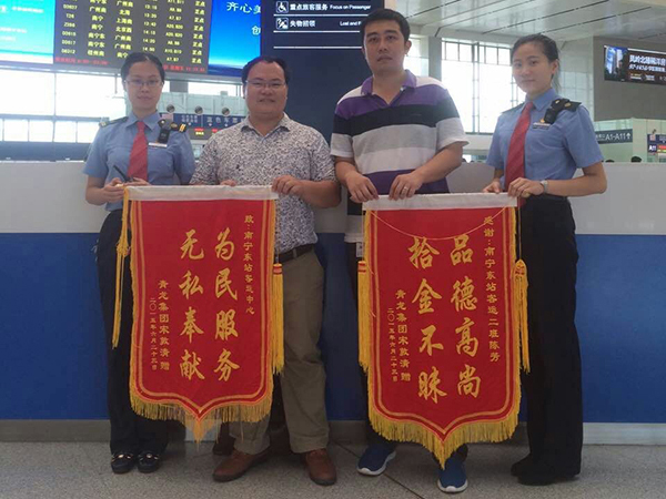 近日,青龍集團(tuán)廣西公司行政部經(jīng)理韋流武先生、設(shè)計(jì)院推廣經(jīng)理周明先生受青龍集團(tuán)宋先生之托,一行二人專(zhuān)程來(lái)到南寧東站客運(yùn)中心,將繡有“為民服務(wù),無(wú)私奉獻(xiàn)”和“品德高尚,拾金不昧”的大紅錦旗送到南寧東站領(lǐng)導(dǎo)和二班陳芳女士手中,衷心感謝動(dòng)車(chē)南寧東站全體工作人員的真誠(chéng)幫助和優(yōu)質(zhì)服務(wù),感謝陳芳女士品德高尚,拾金不昧的精神,并為她們的正能量點(diǎn)贊!