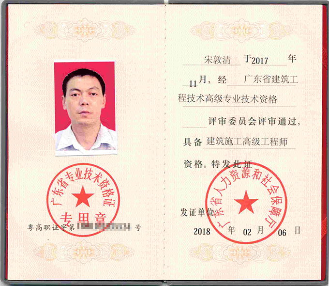 熱烈祝賀公司董事長宋敦清成功獲得“建筑施工高級工程師”資格