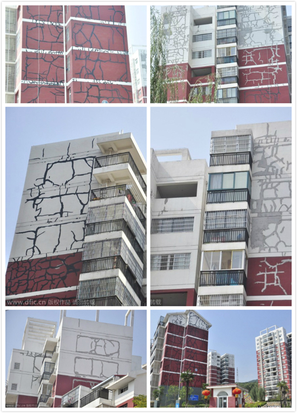 2014年10月10日,武漢市建成已經三年的江夏區(qū)武昌大道某小區(qū),房屋外墻就出現(xiàn)不同程度的裂縫,于是有的樓棟側墻整面用黑色防水涂料涂成框框以防滲漏,從遠處觀看,似乎給墻體綁上了“繃帶”。但是這樣的外墻“綁繃帶”真的能堵住滲漏嗎?