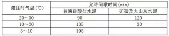 ⑺混凝土澆筑必須連續(xù),因施工需要留設(shè)施工縫,必須征得設(shè)計(jì)同意,并得到監(jiān)理認(rèn)可。允許間歇時(shí)間具體見(jiàn)下表;搗固選用的振搗器,其頻率、振幅、振動(dòng)速度等參數(shù)視混凝土的塌落度及骨料顆徑而定。