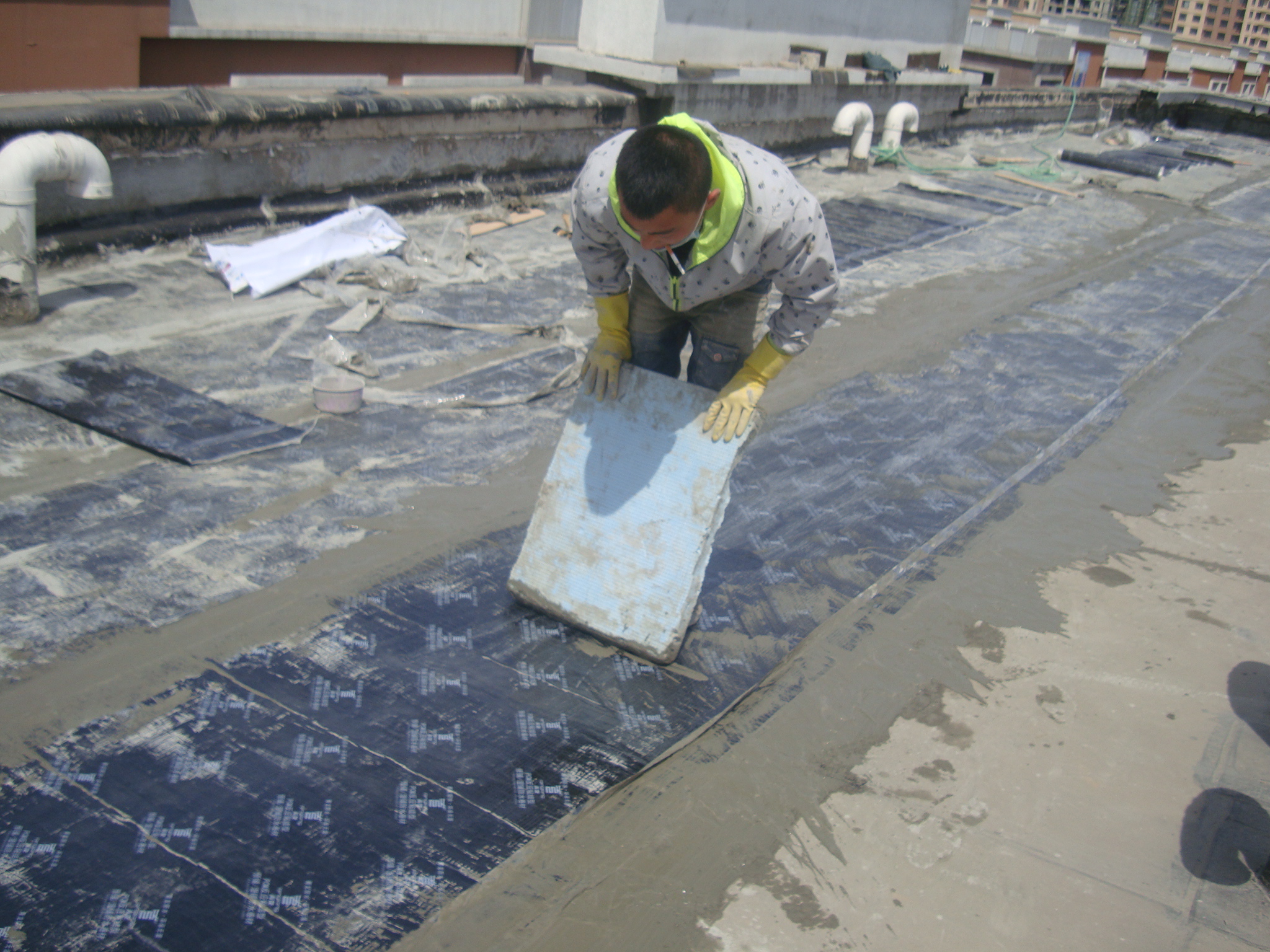 將卷材對準(zhǔn)基準(zhǔn)線試鋪,在約5m長處用裁紙刀將隔離紙輕輕劃開,注意不要劃傷卷材,將未鋪開卷材隔離紙從背面緩緩撕開,同時將未鋪開卷材沿基準(zhǔn)線慢慢向前推鋪。邊撕隔離紙邊鋪貼。鋪貼好后再將前面試鋪剩余的約5m長卷材卷回,依上述方法粘貼在基層上。