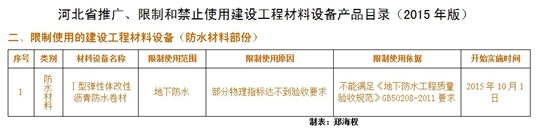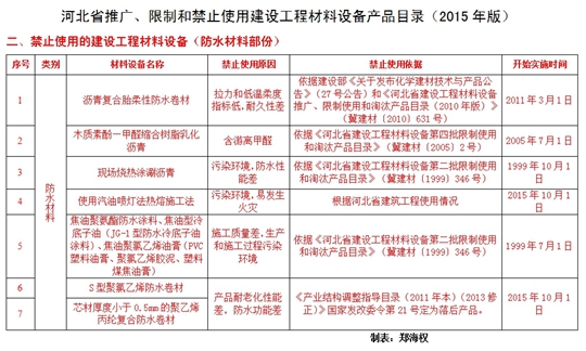 2015年版目錄是前七批“推廣、限制和淘汰使用產(chǎn)品目錄”的綜合更新版。其中,保留了仍需推廣、限制和禁止使用的建材裝備,結(jié)合近幾年河北省工程建設(shè)實(shí)際,又增補(bǔ)了新的內(nèi)容。本目錄共涉及182種產(chǎn)品,包括推廣類(lèi)87種(新列入29種),限制類(lèi)25 種(新列入12種),禁止類(lèi)70種(新列入20種),新列入的各類(lèi)產(chǎn)品,生效時(shí)間從2015年10月1日起實(shí)施。其中防水材料部份,推廣類(lèi)6項(xiàng)(新列入2項(xiàng)),限制類(lèi)1項(xiàng)(新列入1項(xiàng)),禁止類(lèi)7項(xiàng)(新列入3項(xiàng))。